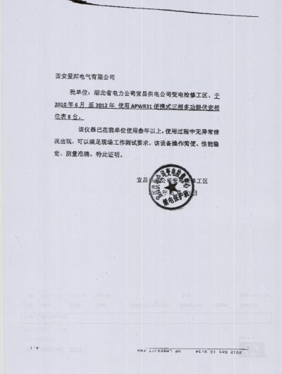? ? ? 湖北宜昌供電公司2010年購買了我公司的Apwr31三相伏安相位表一批,自使用以來,性能穩(wěn)定,操作簡單,精度高,滿足現(xiàn)場測試要求。
