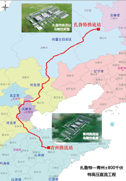 扎魯特—青州特高壓工程起點(diǎn)位于內(nèi)蒙古通遼市,終點(diǎn)位于山東濰坊市,途經(jīng)內(nèi)蒙古、河北、天津、山東4?。ㄗ灾螀^(qū)、直轄市),新建扎魯特、青州2座換流站,換流容量2000萬(wàn)千瓦,線路全長(zhǎng)1234千米,送端換流站接入500千伏交流電網(wǎng),受端換流站分層接入500/1000千伏交流電網(wǎng)。工程投資221億元,于2016年8月獲得國(guó)家發(fā)改委核準(zhǔn),計(jì)劃2017年建成投運(yùn)。